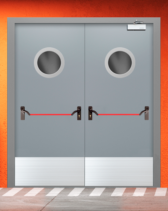 Специализированная полуторная дверь противопожарного назначения класса EI 30 в серой цветовом решении.