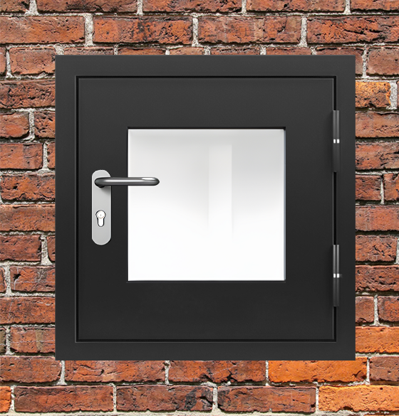 Специализированное решение люк металлический черный с окном и блестящей ручкой для комплексного обеспечения требований пожарной безопасности.