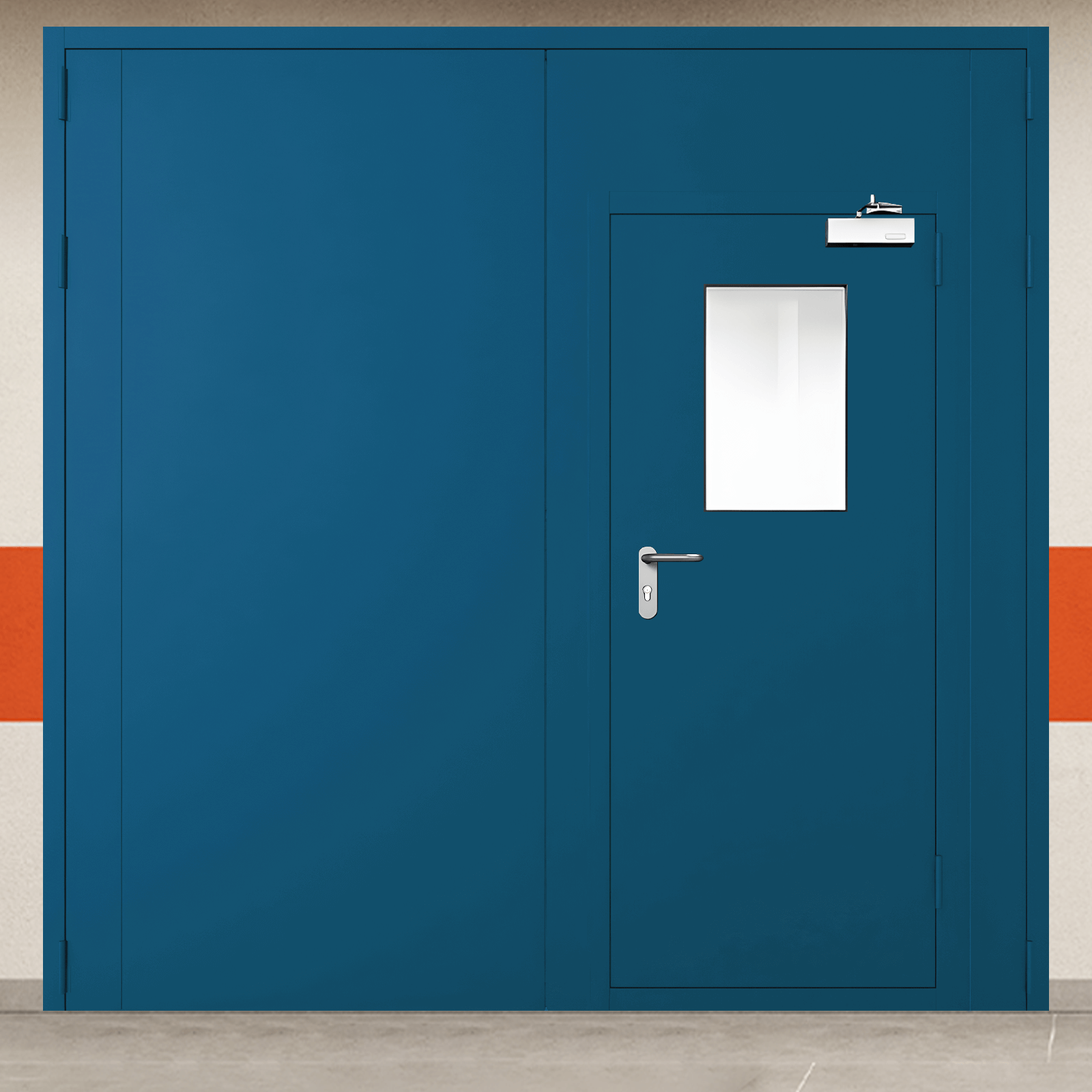 Профессиональное решение для обеспечения пожарной безопасности - ворота металлические двустворчатые синие с двумя окнами, блестящей ручкой с сертифицированными характеристиками надежности.